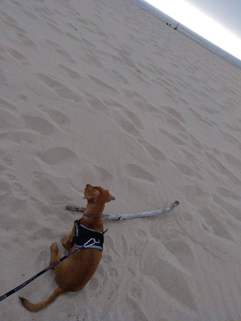 Mamá dice que toda ese agua es el mar y toda esa arena es la playa. A mí me da igual cómo se llamen, para mí siguen siendo agua y arena, pero en unas cantidades enormemente grandes. El mar se mueve todo el rato y la arena tiene un olor riquísimo, pero meto los hocicos y no saco nada, solo el olor, y se me quedan pegados granitos que me hacen cosquillas. Por encima del mar hay pájaros grandes y blancos que yo no había visto nunca, y chillan como si se quejaran por algo. Y siempre hay mucho viento.