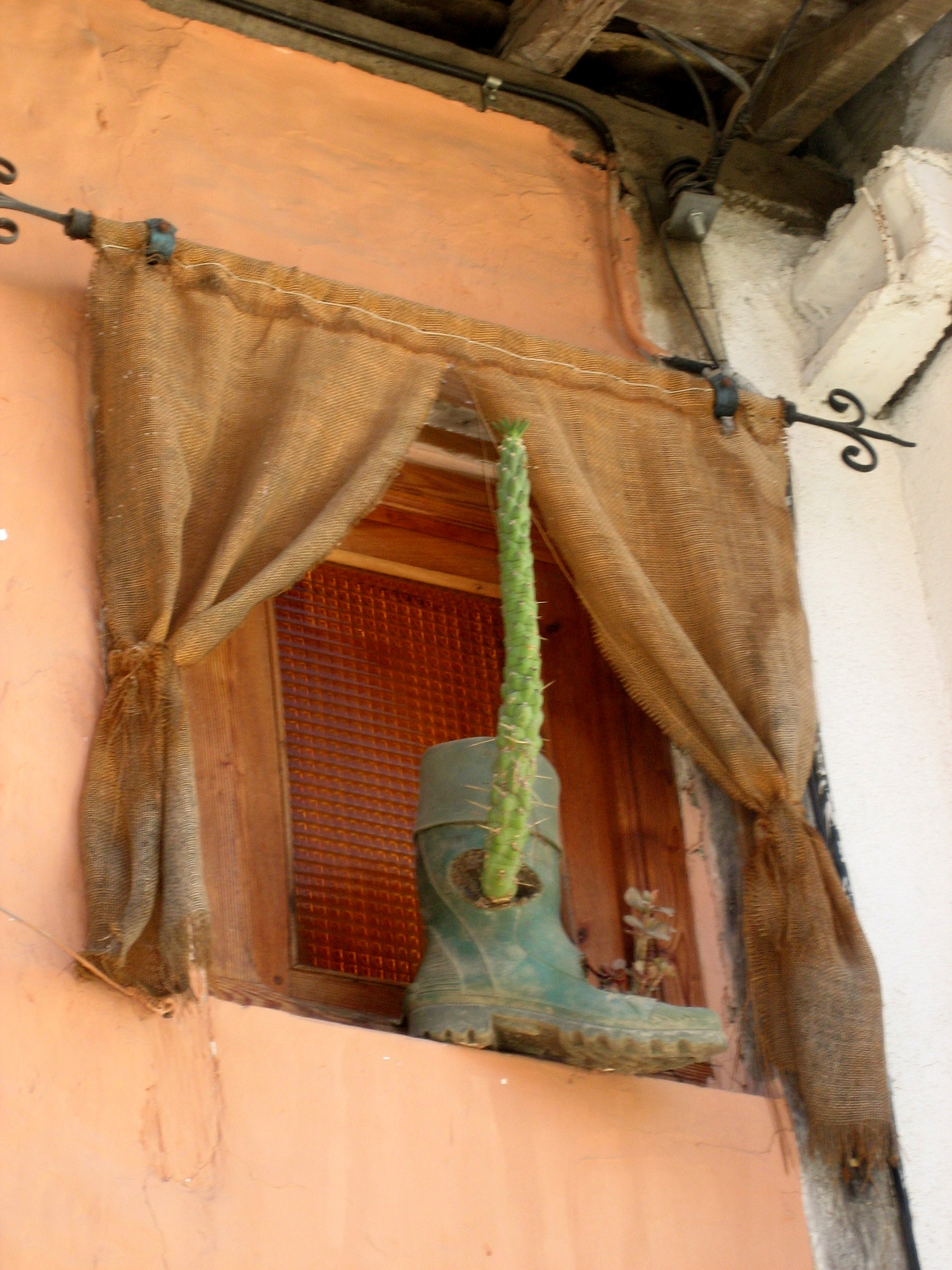 La casa es tan pequeña que, a poco que pase algo de tiempo, ojo no vaya la enredadera a comerse la fachada, de tan frondosa como está, aunque parece recortarse un poco para dejar sitio a la bruja, que todo el día dale que te pego vigilando la puerta para que nada ni nadie entre o salga al descuido. Hasta la puerta separa, que se abre a la mitad para que la casa no se invada o se vacíe de golpe. No hubo nunca geranios en el balcón, que a la bruja le asusta tanto color y tanta alegría, no vaya a ser que luego se amustien o le roben las flores y la dejen suspirando por el rojo reventón; el cactus no, el cactus es otra cosa, crece y crece en la bota rota y nadie lo toca ni se le acerca.