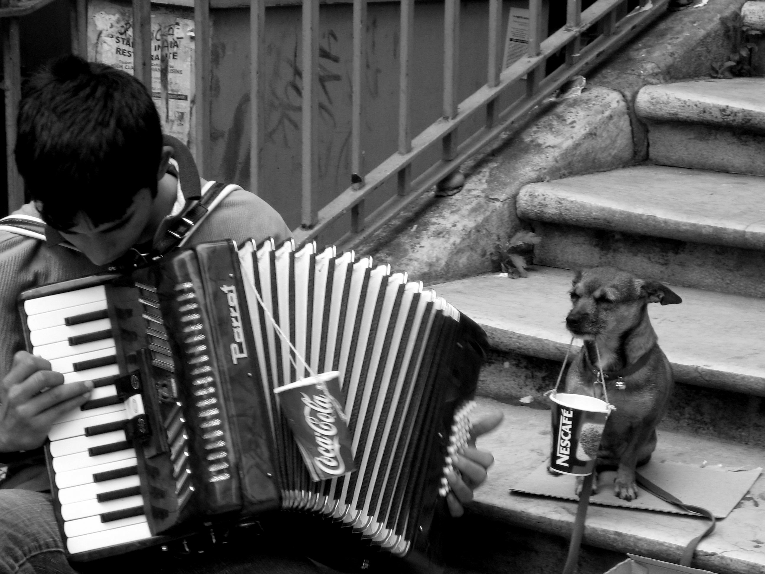 El caso es que, cada mañana, cargamos el viejo acordeón heredado del abuelo y los vasos de refresco para las monedas y nos vamos hasta el centro de la ciudad. Trabajamos hasta mediodía y por la tarde todos los días que queremos o, más bien, todos los días que no llueve o no hace demasiado frío. Los turistas nos miran con curiosidad, muchos se paran y nos sacan fotos; en realidad, no sé si se detienen a escuchar o porque les gusta vernos tan concentrados en la tarea. Nosotros vamos a lo nuestro y no miramos a nadie, nos hemos dado cuenta de que son más generosos así, si, simplemente, nos dejamos observar, como los peces en las peceras.